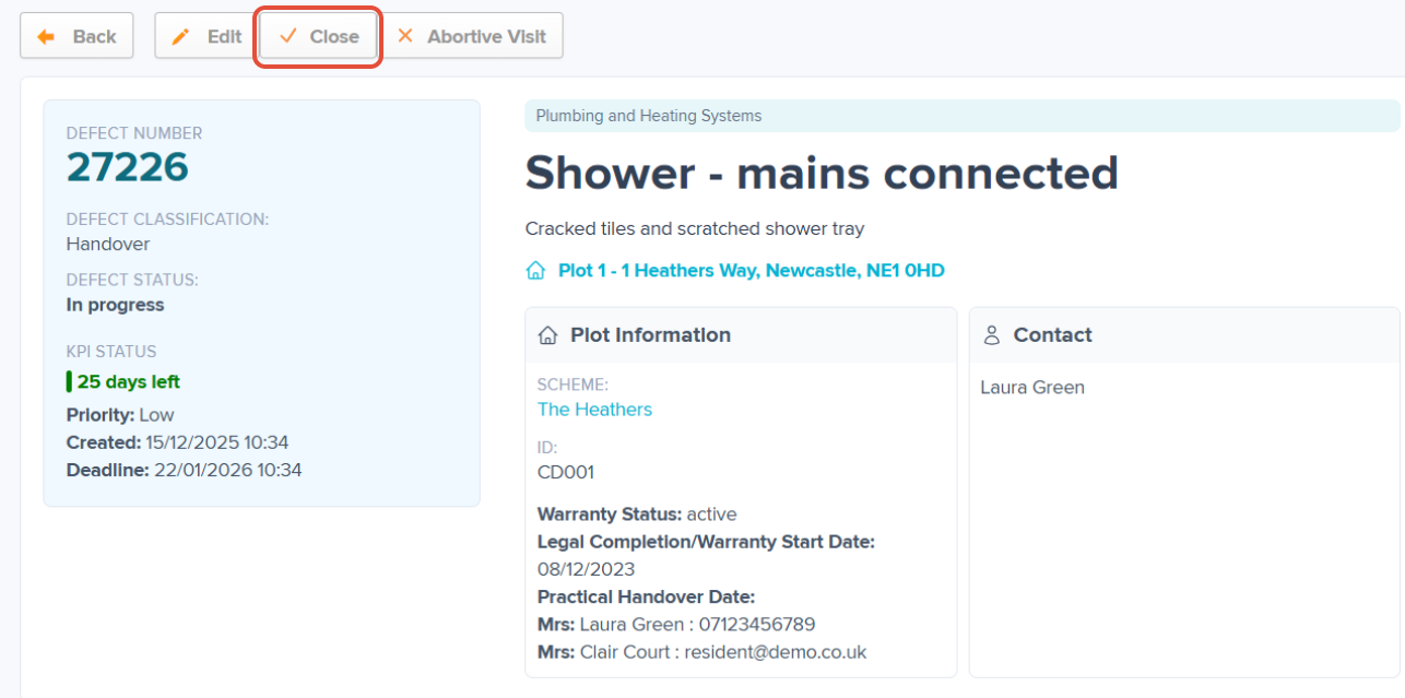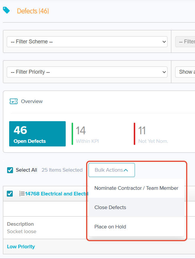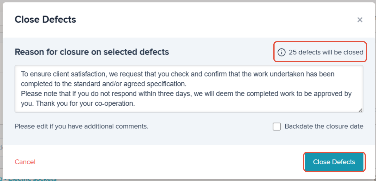 The closure box will then appear detailing how many Defects you are closing, you can amend the closing comment at this stage also. Once complete, click 'Close Defects'