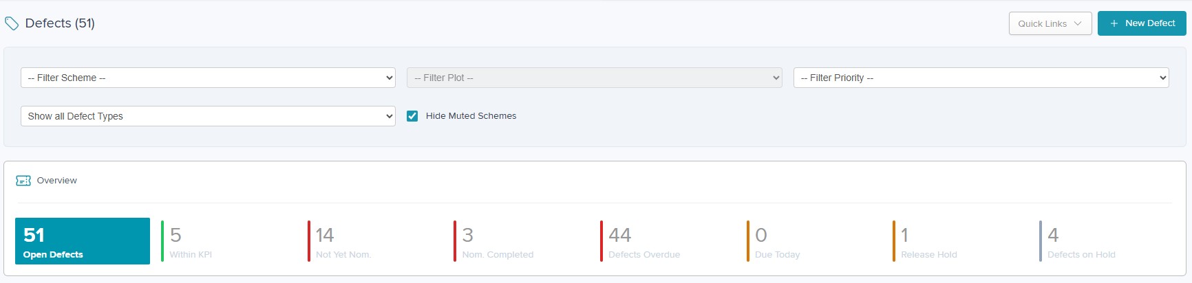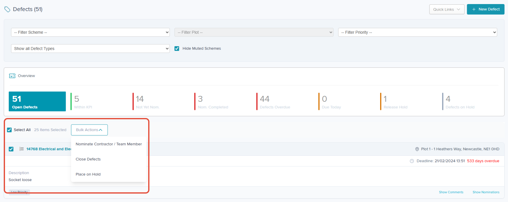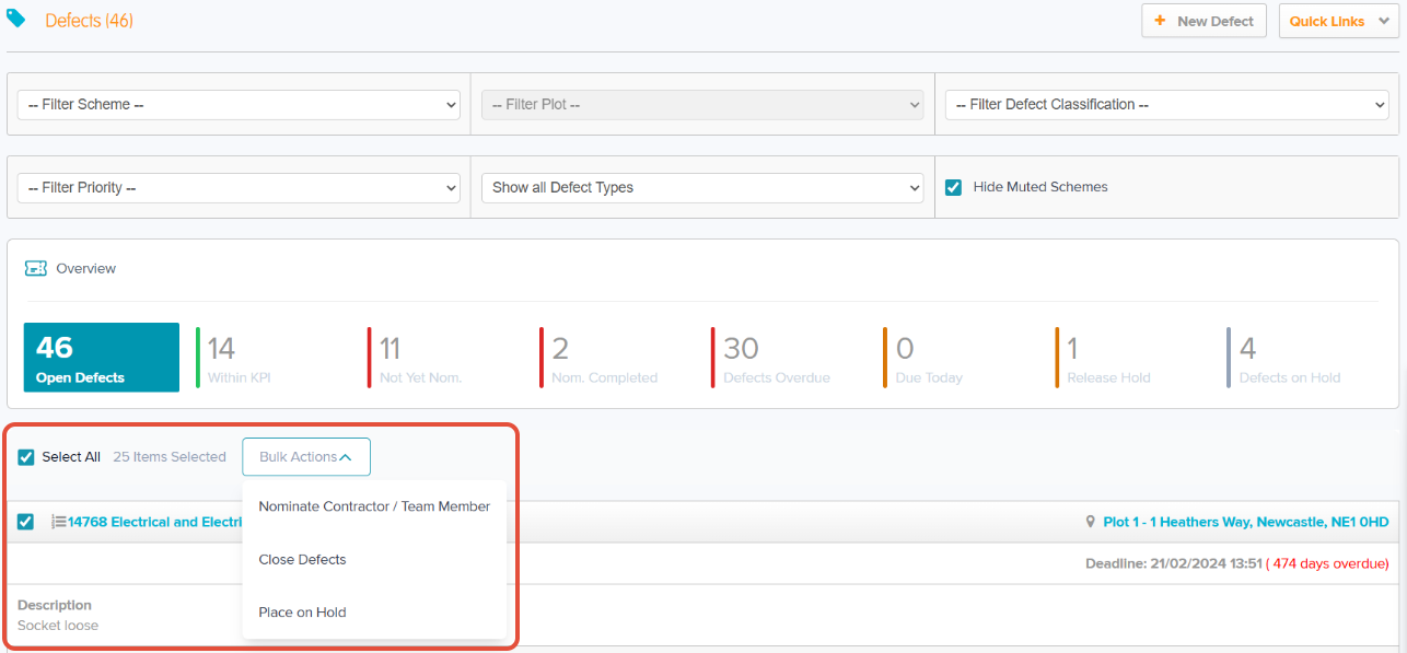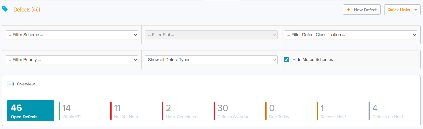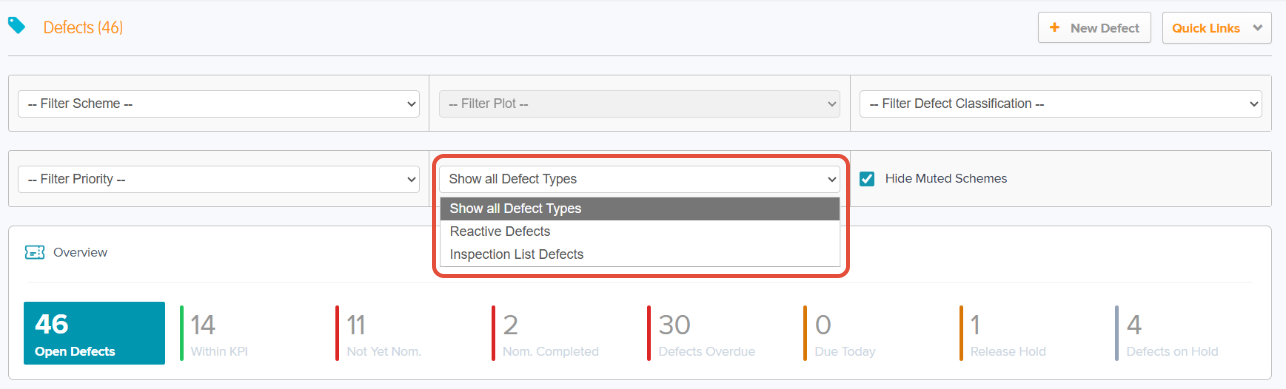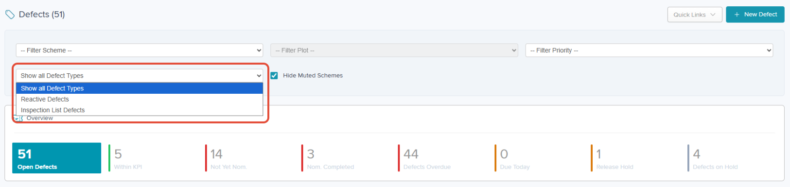 In addition to Scheme/Plot/Priority filters, there is a filter option to view 'Reactive Defects' (previously known as Tickets) or 'Inspection List Defects'