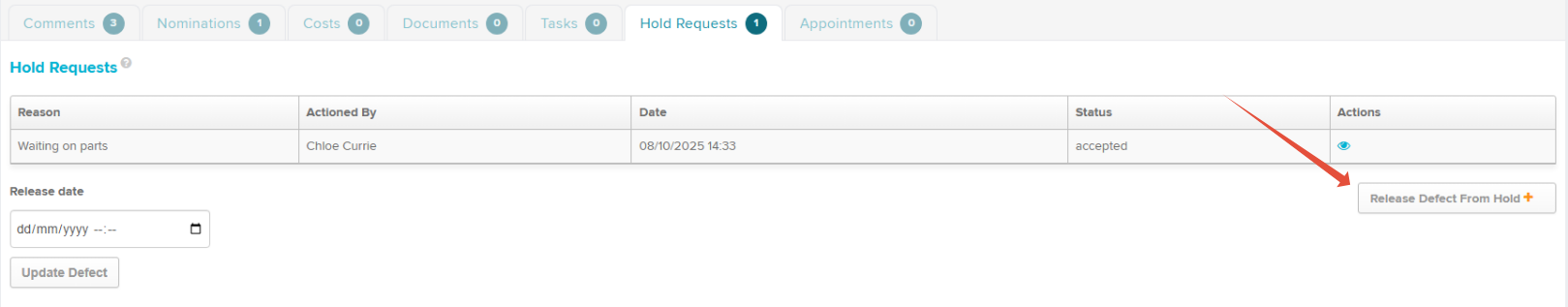 Once the Defect is ready to be released from hold, click on Release Defect From Hold within the 'Hold Requests' tab.