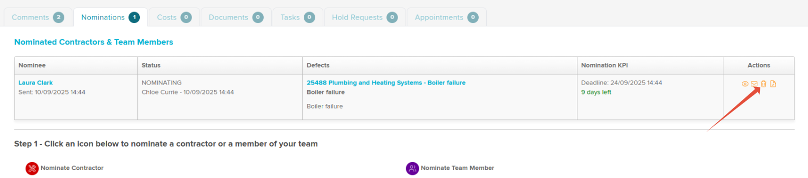 If there is no open appointment attached to the nomination you can remove the nomination whether it is in a nominating, accepted or rejected state by selecting the bin icon.