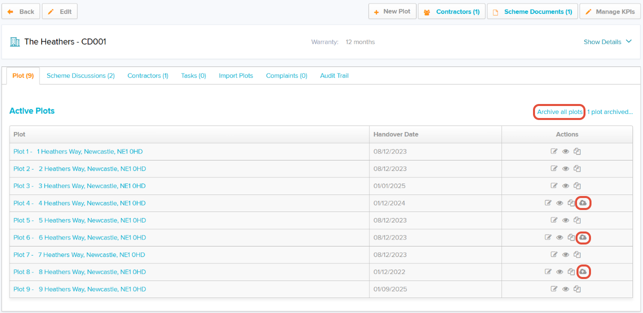 There is an option to 'Archive all plots' which will archive the plots that meet the criteria to be archived or you can archive individual plots from Scheme view by clicking the cloud Archive icon.
