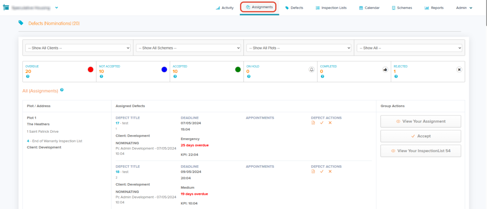 There are various filter options on this page including Client, Scheme, Plot & Defect Type.