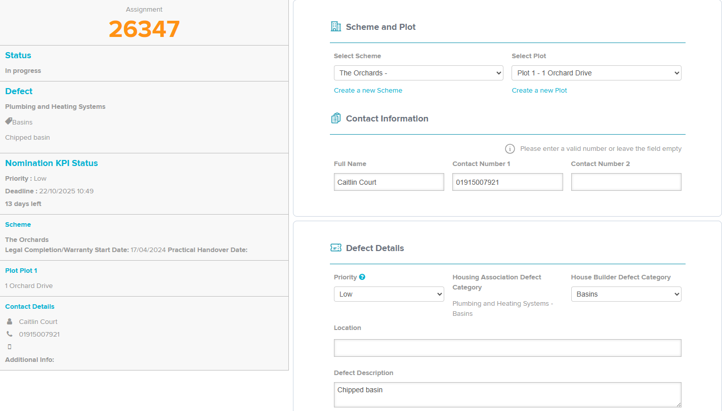 Step 2: You will be redirected to create the Defect within your account. If the Scheme and Plot already exist in your account—or if you’ve had an assignment for that plot before—this will auto-populate.