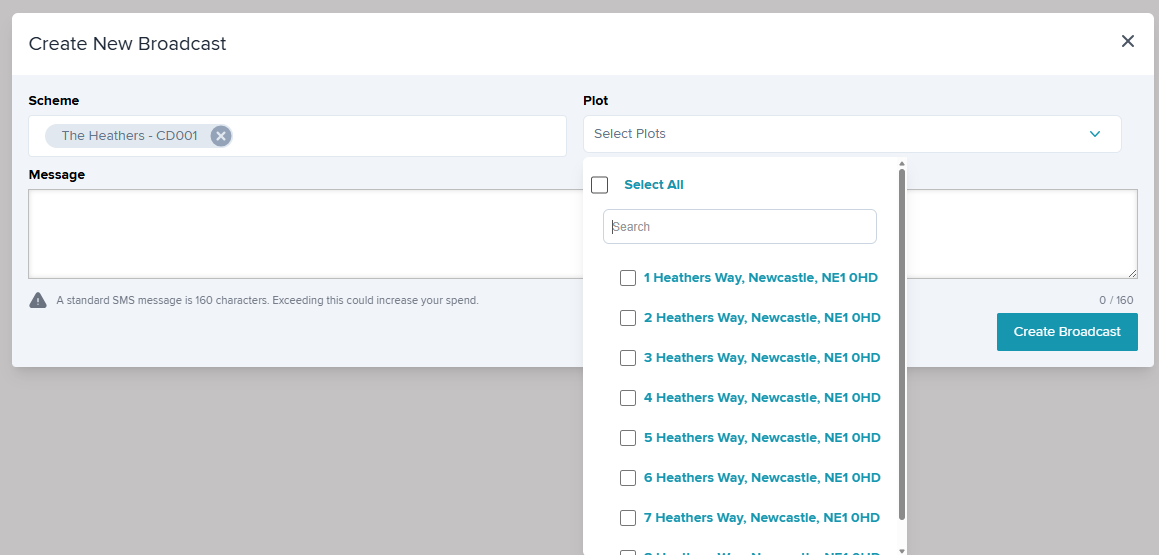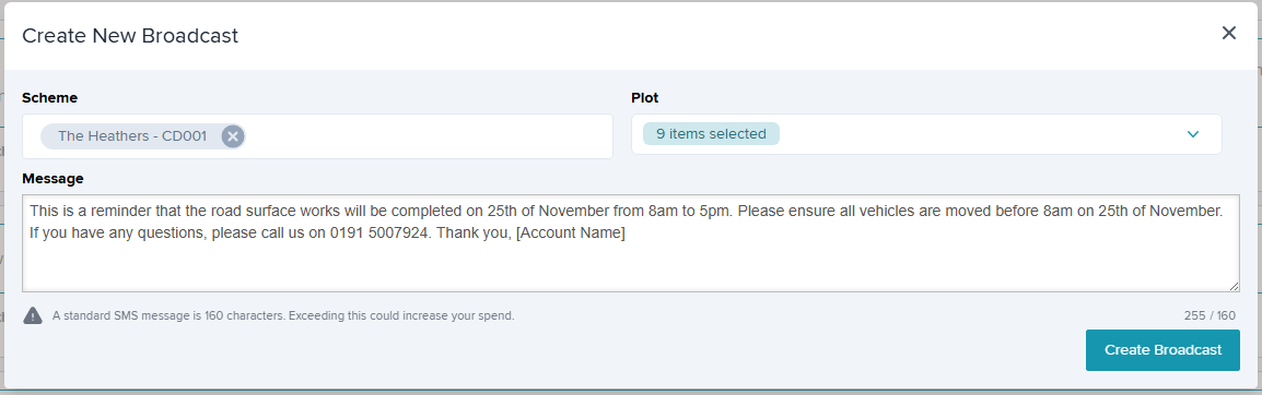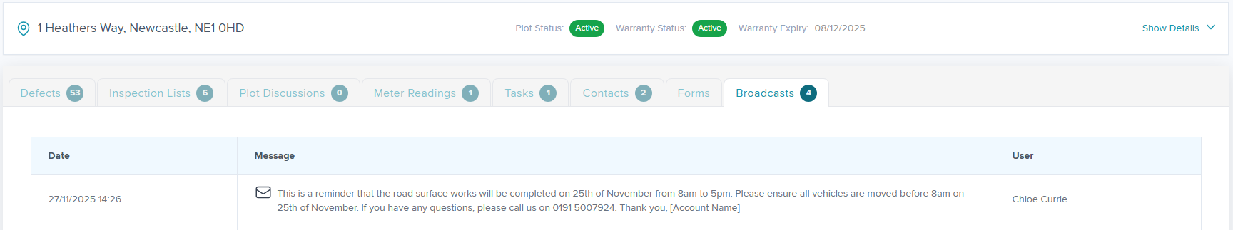 An audit trail will be recorded in the 'Broadcasts' tab on the Plot. This includes a date & time stamped copy of the broadcast message.