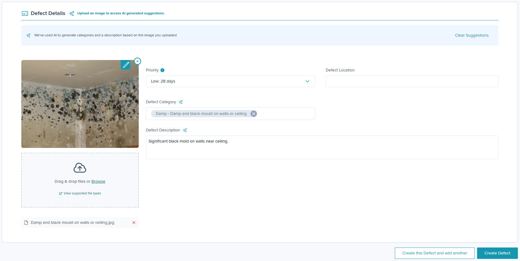 Step 4: If you have an image of the Defect upload this by selecting 'Browse'. The AI generator will then auto-populate the Defect Category and Description which can then be amended if required.