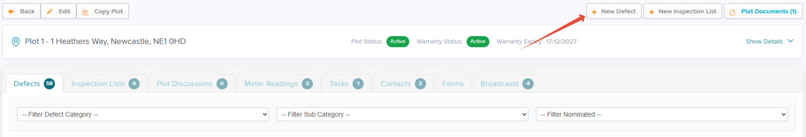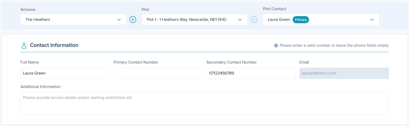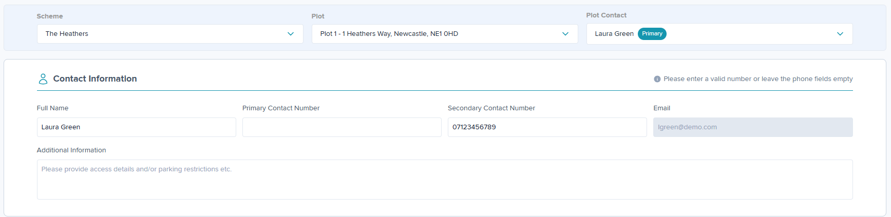 Step 3: The contact details will auto-populate for plots with a primary contact in the 'Contacts' tab, or when details have been previously entered when adding a Defect.
